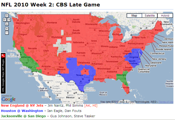 Other areas include Washington DC, Houston, Jacksonville and San Diego all of which will have teams playing at that time as well, on CBS. (Although at this time, the San Diego game is in danger of being blacked out in Southern CA.)