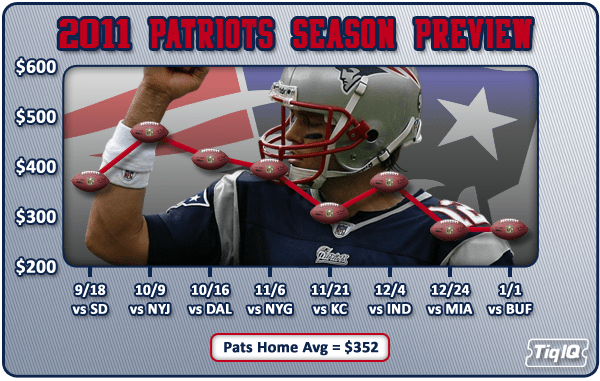 TiqIQ Ticket Watch – Patriots 2011 Season Preview Date: September 8, 2011Author: Bruce Allen 0 Comments Here’s a look at the Patriots 2011 home schedule, and which games are most in demand and the current average prices for those games. Share this: Click to share on X (Opens in new window) X Click to share on Facebook (Opens in new window) Facebook Like Loading... Related